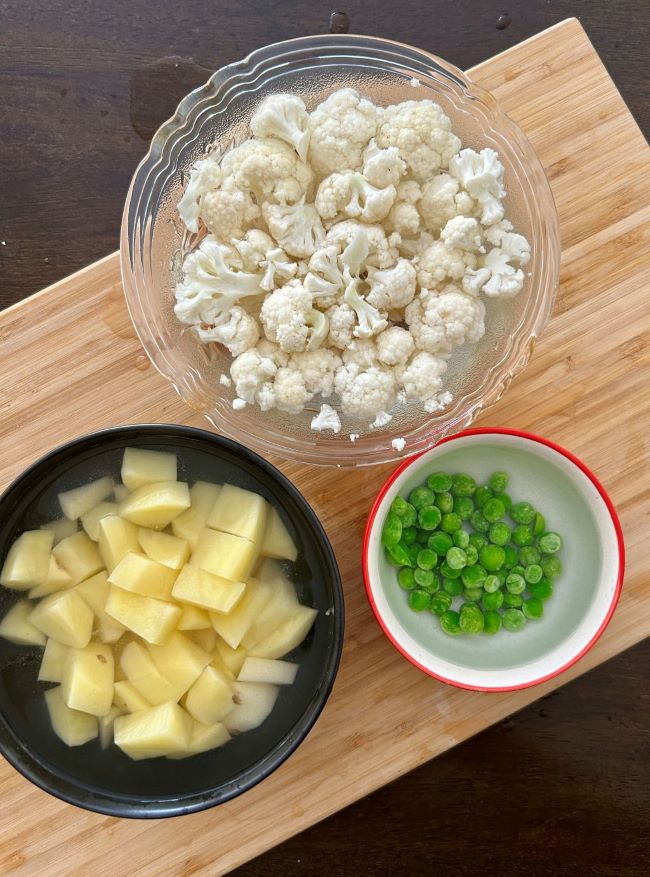 - Cut the cauliflower leaves off and pluck equal sized florets. Dunk them in a bowl of hot water and a teaspoon of salt. Peel the potatoes and dice them up in the same size as the cauliflower florets. Take a handful of frozen peas and add them to a bowl of hot water as well.