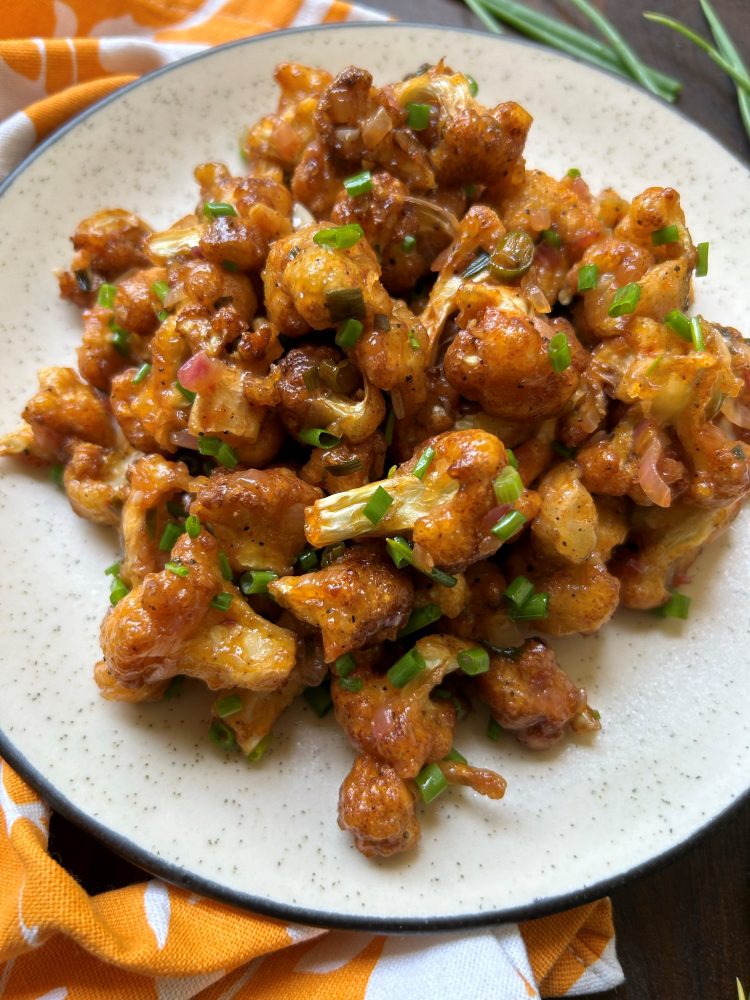 Blanched cauliflower is deep fried with a cornflour/flour batter and swirled is a delicious base prepared with soy sauce, tomato ketchup, vinegar and generous amount of onion, ginger, garlic, spring onions and green chillies.